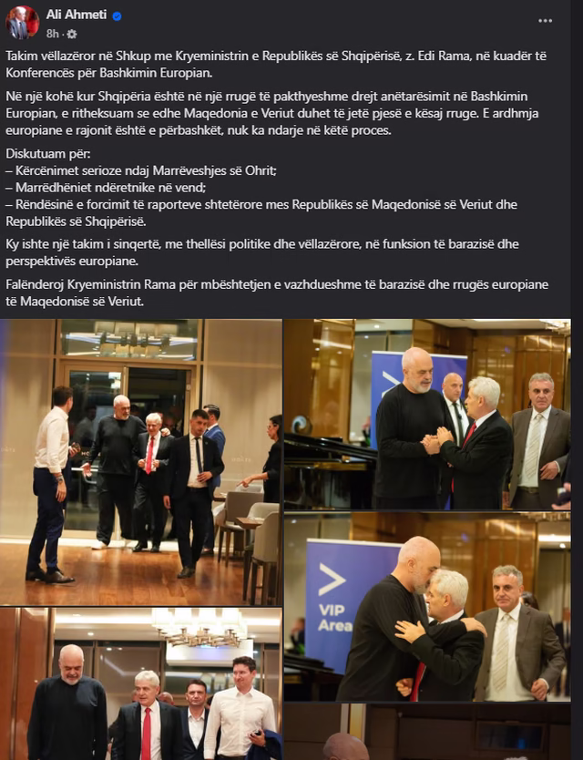 SHKUP– Ali Ahmeti, Kryetari i BDI-së, në Maqedoninë e Veriut përmes një postimi në  rrjetet sociale ka ndarë disa foto me Kryeministrin Edi Ramai nga takimi në Shkup.