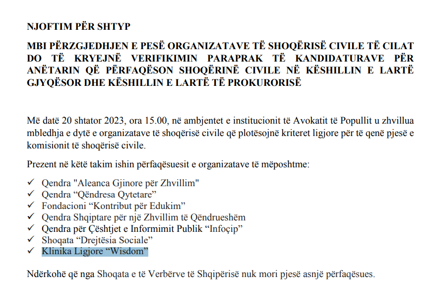 Radar.al shkruan se Qendra Klinika Ligjore “Wisdom”, pjesë e Kolegjit Universitar Wisdom, ishte përzgjedhur nga Avokati i Popullit në Shqipëri si një nga kandidaturat e organizatave të shoqërisë civile. Pesë nga organizatat e shoqërisë civile, mes tyre dhe Wisdom do të kryenin verifikimin paraprak të anëtarit që do ishte nga shoqëria Civile në Këshillin e Lartë Gjyqësor dhe në Këshillin e Lartë të Prokurorisë, shkruan Radar.al.