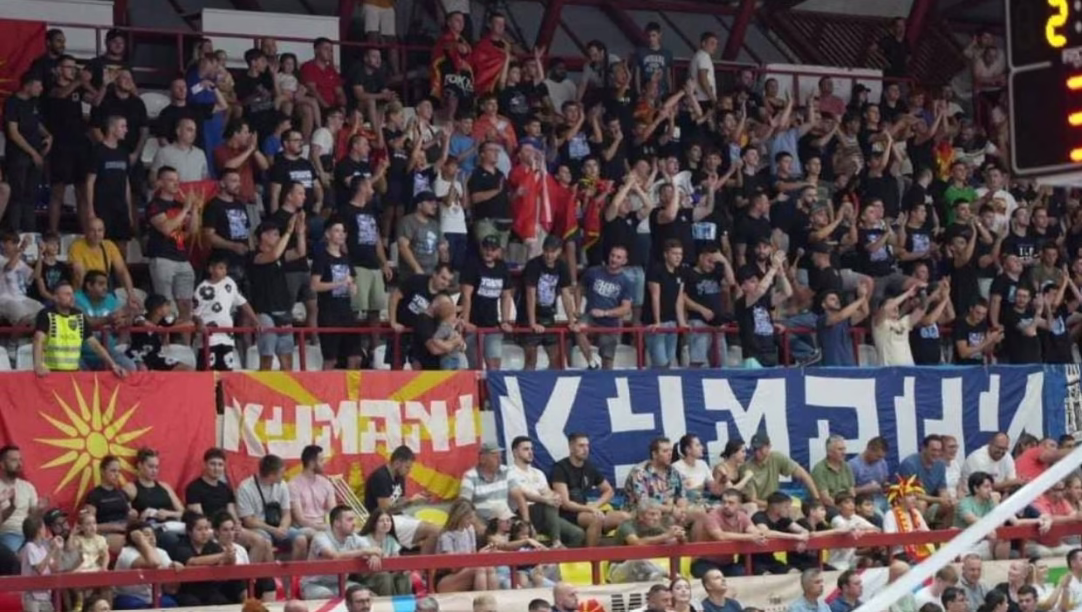 Në tribunat e ndeshjes, ku ishin të pranishëm kryeministri Hristijan Mickoski, kryetari i Kumanovës Maksim Dimitrievski dhe zyrtarë të tjerë të lartë, tifozët thërrisnin parulla si: