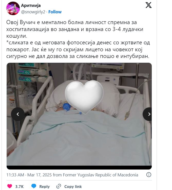 Ndërkohë kjo foto e Presidentit Vuçiç në dhomën ku po trajtohen të lënduarit kanë shkaktuar reagime të ashpra te qytetarët në Maqedoninë e Veriut.