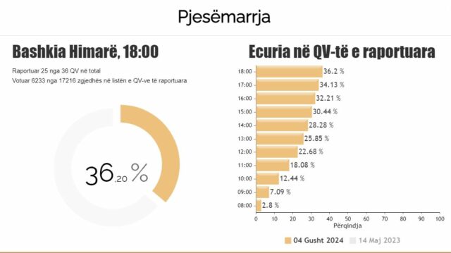 Pjesëmarrja e numrit të votuesve deri në orën 18:00 në zgjedhjet e pjesshme për kryetarin e bashkisë së Himarës është 36.2% , sipas KQZ.